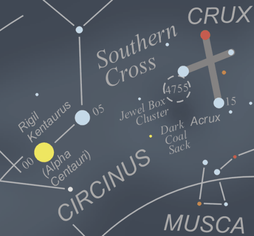 These maps show the sky visible from the USA, Canada, Caribbean, Europe and Asia. A detailed view (59K) of the colour map shows the area around the Constellation of Crux.
